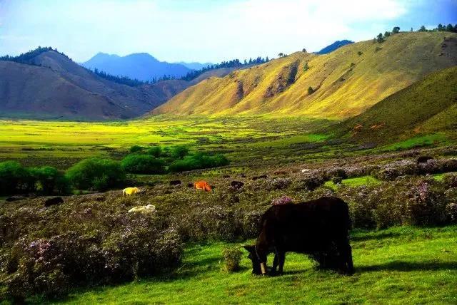大羊場(chǎng)則是一片高原牧場(chǎng)風(fēng)光,主要由高山草甸組成,在草甸上向東可看見(jiàn)玉龍雪山、哈巴雪山的皚皚白雪;向西可盡覽碧羅雪山那綿延千里的磅礴氣勢(shì);向北可遙望白茫雪山、梅里雪山的英姿;南面穿過(guò)原始森林則可到羅古箐情人壩。草甸兼有草原的壯美,又多了一份草原所沒(méi)有的靈秀之氣,成片的落葉松是大羊場(chǎng)的一大盛景。每年從5月底開(kāi)始,一望無(wú)際的杜鵑綻放出紫色的花朵,隨著時(shí)間的推移,杜鵑由紫變紅,使大羊場(chǎng)變得紅紅火火、無(wú)比絢麗。周?chē)男∩桨蛔B著一座,構(gòu)成了獨(dú)特的高原丘陵景觀。