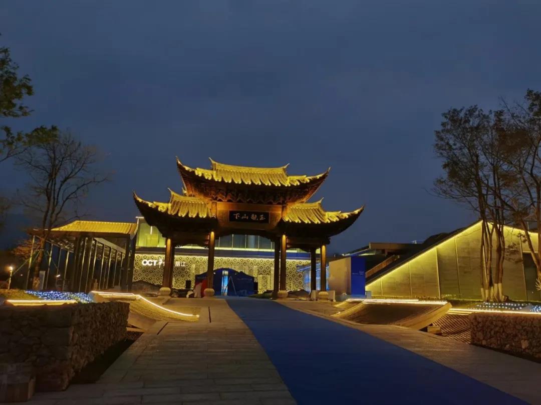 展示中心亮眼的流光,靜靜輝映著,盡管已是暮色四合,但遠(yuǎn)望這里,還是一片明朗。遠(yuǎn)掛的燈球透出橘紅色的光,似乎都在各自訴說(shuō)著從前的故事,給寂靜的山海平添了些生機(jī)。