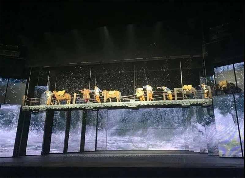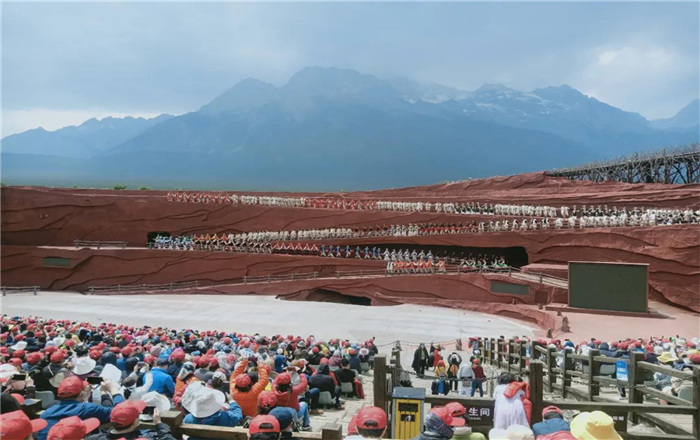 當(dāng)你走進(jìn)劇場(chǎng),一個(gè)人工崖壁首先進(jìn)入眼簾,它以美麗的玉龍雪山作為舞臺(tái)背景,當(dāng)你在觀看表演時(shí)仿佛看到了六百年前茶馬古道上的剽悍馬幫穿行的場(chǎng)面,給你帶來(lái)的視覺(jué)沖擊力十分強(qiáng)勁。