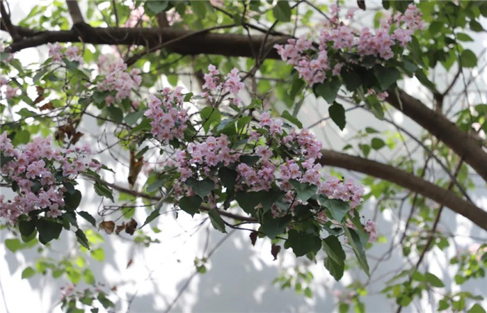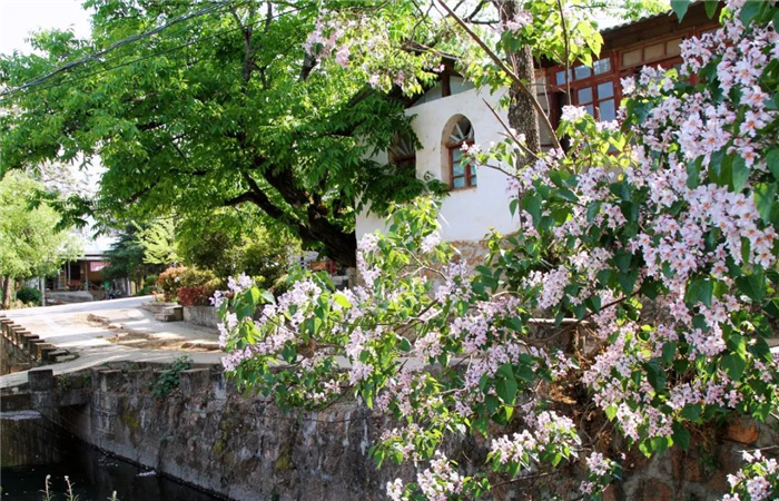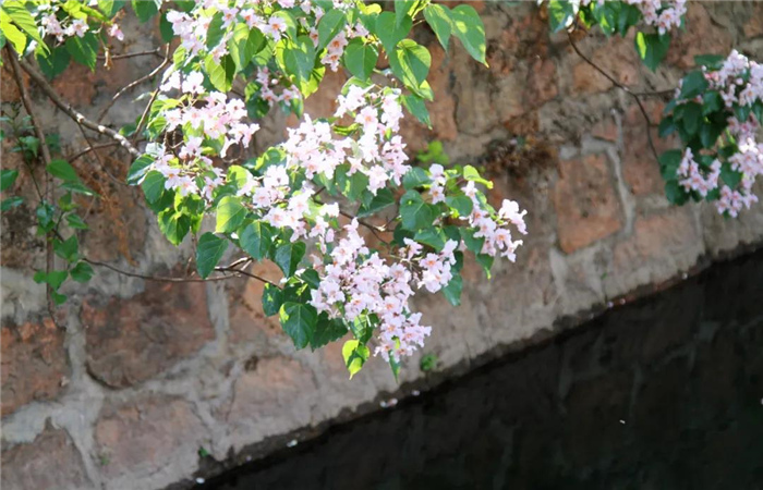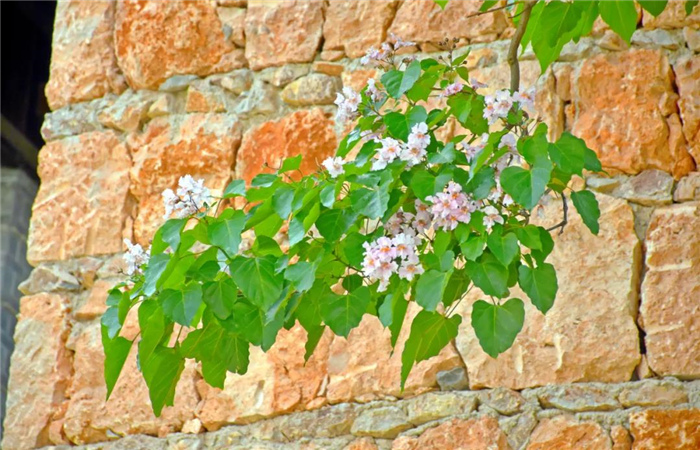 抬頭的瞬間,你會看見一簇簇的楸木花掛滿了枝頭,它們和枝條間垂下來“一縷縷青絲”共同映襯著一側的石墻,宛如一條條從山間流下的瀑布。時而隨風奔騰,時而靜如處子。
