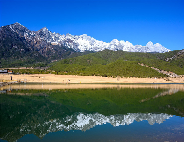 站在玉湖湖畔,連綿不絕的雪山倒映在湖面上,宛若一巨幅畫卷,令人心曠神怡,如此美景,人間少有。