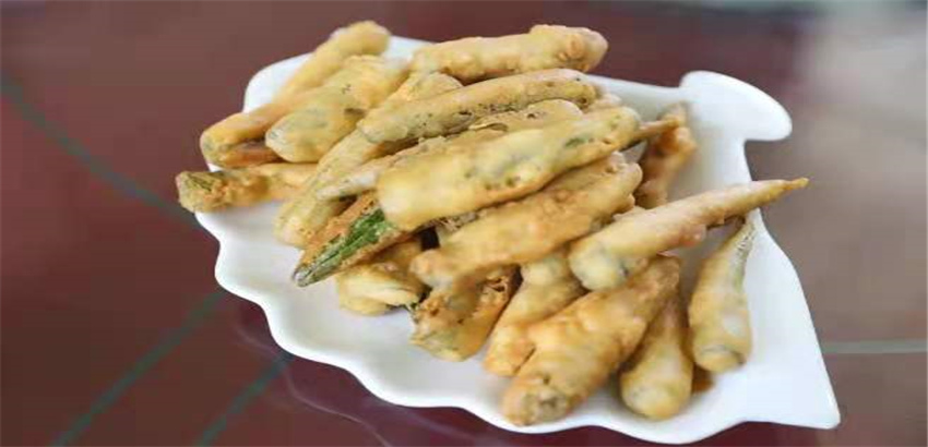 比藕芽還講新鮮的是荷花,只有點(diǎn)了這份菜,老板才帶著我們?nèi)ズ商晾铿F(xiàn)摘。老板說,荷花只能吃白色的。我問,粉色的有毒嗎?老板說,不是,粉的炸出來發(fā)黑,不好看。