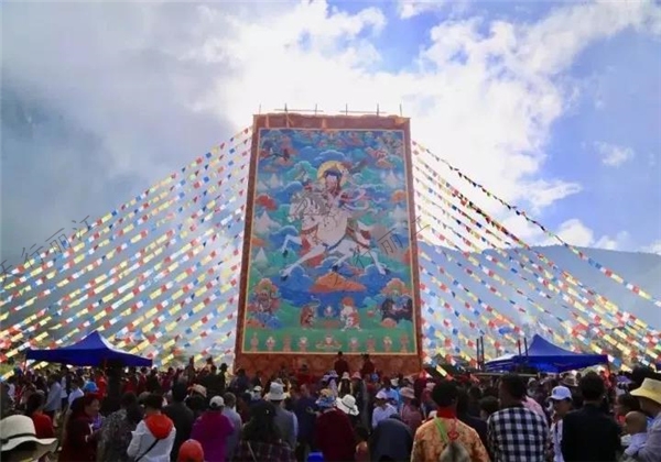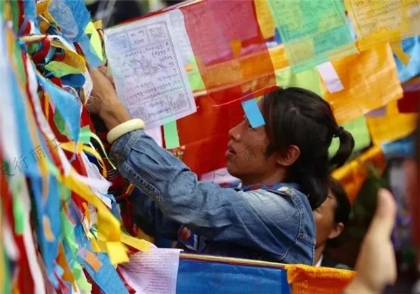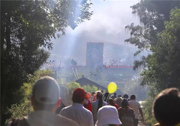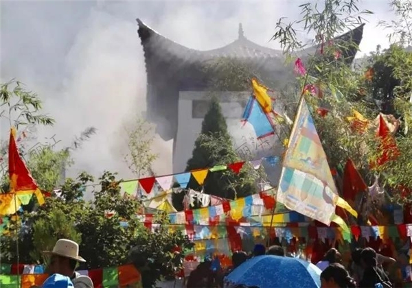 現(xiàn)場香火繚繞,經(jīng)幡密布,虔誠的人們口中念念有詞,他們在感恩格姆女神的保佑。
