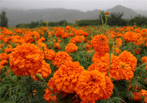 黃橙橙的花朵呈半球形花瓣重重疊疊豐滿碩大葉綠花艷,黃綠交輝遠(yuǎn)遠(yuǎn)望去,如同一片片橘色汪洋。