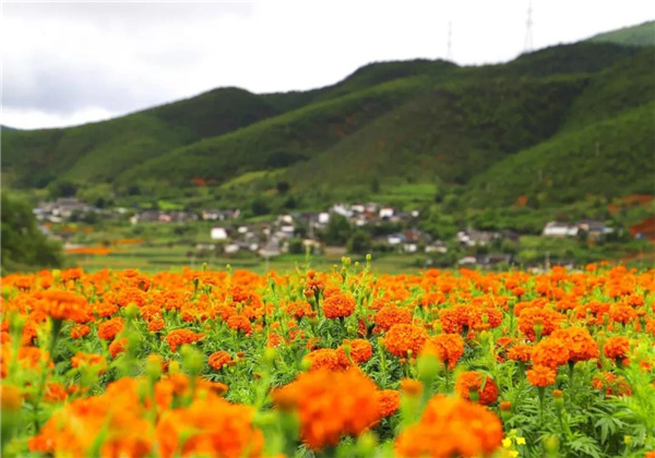花簇與山川、屋舍、田園相融自成畫卷,美不勝收鮮艷的花在天空下從門前一直鋪到山坡上猶如一塊華麗的地毯鋪在茵茵芳草之上。在此處游走得久了感覺連村莊都變得熱情似火,充滿希望。
