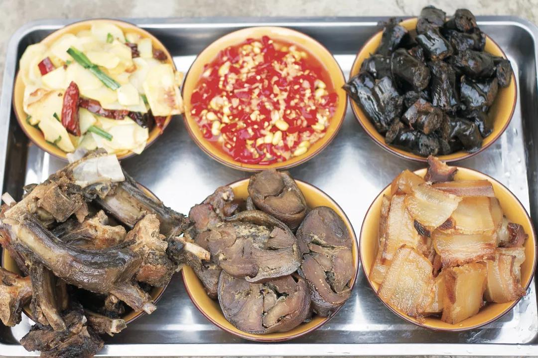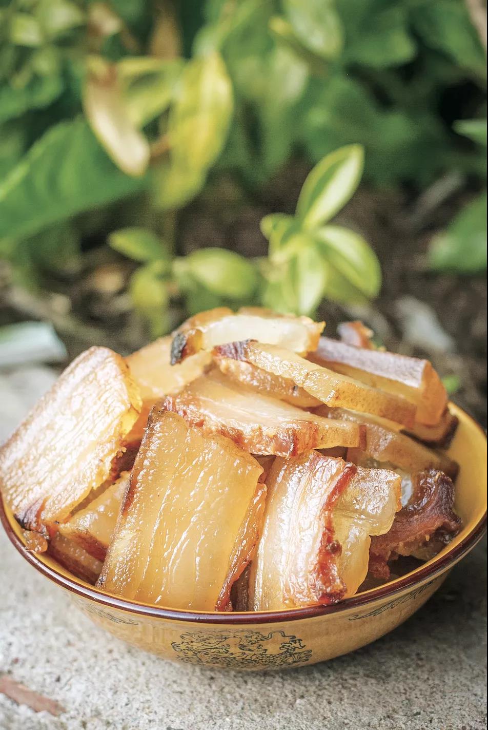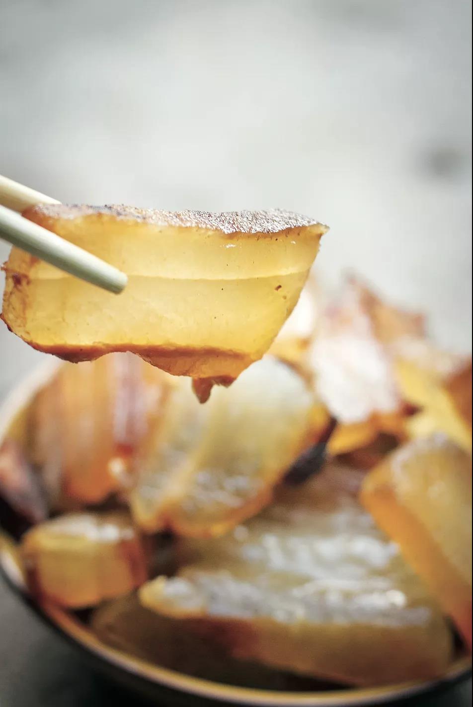 晚飯前,魯汝阿媽割下了一圈豬膘肉,拿到溫?zé)岬奶悦姿泄蜗锤蓛?,又在溫水里清洗了幾遍,最后上熱鍋蒸熟、切片,原先黑黢黢的豬膘肉搖身一變成了黃燦燦的一盤帶皮膘肉。我還來(lái)不及吞咽口水,同行的人已經(jīng)抓了一片放到嘴里?!捌け∮薪绖?,豬膘咸香適中,肥而不膩?!蔽乙粐L,果然,沒(méi)嚼上幾口,豬膘已經(jīng)在嘴里化開(kāi)了,暖滋滋的。