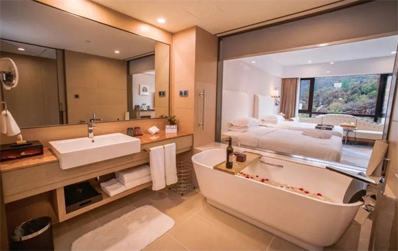 偌大的落地窗寬敞明亮,將窗外的風景引入室內(nèi)?;蜻h眺玉龍雪山雪峰皚皚,或觀文筆山郁郁蔥蔥,或賞文筆海波光粼粼,或看庭院瀑布流水潺潺,讓你足不出戶也能欣賞不同風情。不僅如此,酒店還打造了十分有特色的庭院客房、觀星套房,無論是閑坐庭院坐享美景,還是臥室躺看星空閃爍,都是旅途中難忘的回憶。