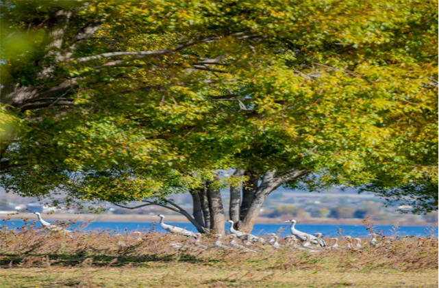 而通過望遠(yuǎn)鏡或長焦鏡頭望向更遠(yuǎn)處的小洲,一大群灰鶴正歇息于此,恍若伊人在水一方。盡管還有一定的距離,但小V依然不敢高聲語,恐怕驚到這群膽小的仙子。