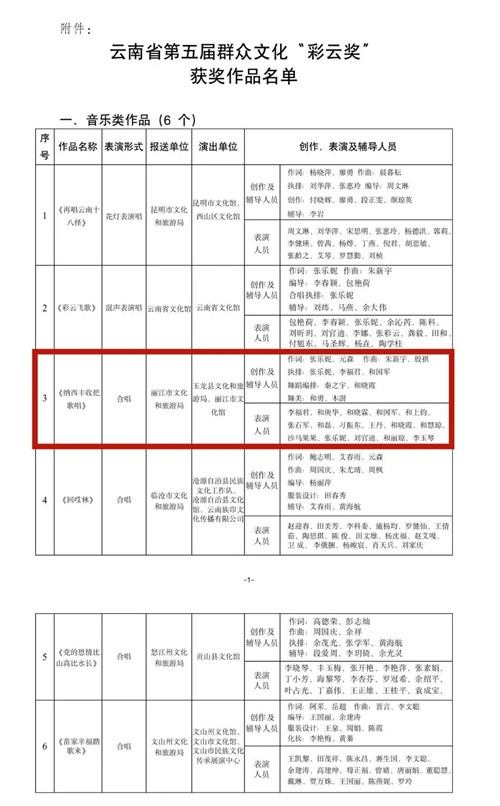 近日? 云南省文化和旅游廳公示了? 云南省第五屆群眾文化“彩云獎(jiǎng)”? 獲獎(jiǎng)作品名單? 麗江市有2個(gè)作品擬獲獎(jiǎng)省文根據(jù)《云南省第五屆群眾文化“彩云獎(jiǎng)”評獎(jiǎng)辦法》,省文化和旅游廳組織開展了云南省第五屆群眾文化“彩云獎(jiǎng)”評獎(jiǎng)工作。經(jīng)專家評委評審并報(bào)送云南省第五屆群眾文化“彩云獎(jiǎng)”活動(dòng)組委會(huì)審議,形成了云南省第五屆群眾文化“彩云獎(jiǎng)”獲獎(jiǎng)作品名單。