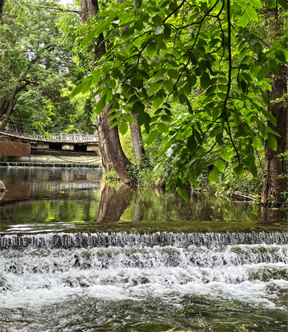 九鼎龍?zhí)兜乃鲎札埲缴侥_的石頭縫隙里,潭水不深,但卻夏季不渾,冬季不淺,一股清澈的流水從石隙中溢出,永遠(yuǎn)滋潤著古鎮(zhèn)。潭周綠柳垂地,翠柏指天,泉水清澈,潭中游魚甚多,被當(dāng)?shù)厝朔顬樯耵~。民間傳說,凡是偷吃龍?zhí)渡耵~者,都會遭災(zāi)禍。由此,神魚得到保護(hù),自我繁衍,悠閑地在泉水中生息。