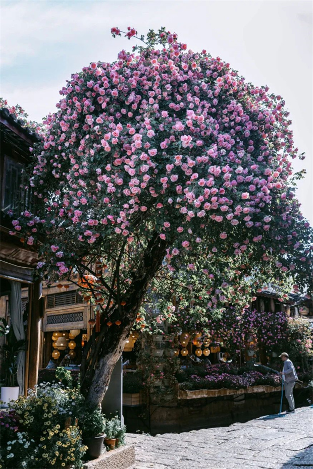 “麗江之路”的美,不僅在于它的花朵,更在于它與麗江古城的相得益彰。在古城的很多角落,你都能找到它的身影。它