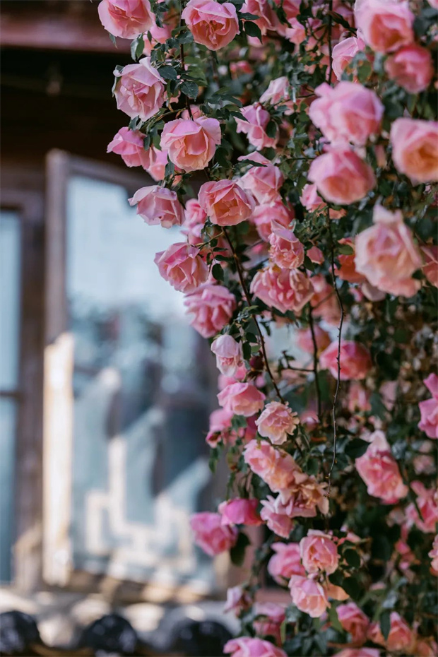 人家的窗欞。那些柔韌的藤蔓,像極了繡娘手中的絲線,將八百年的古城細細縫制成一件粉色的霓裳。曾有位英國園藝