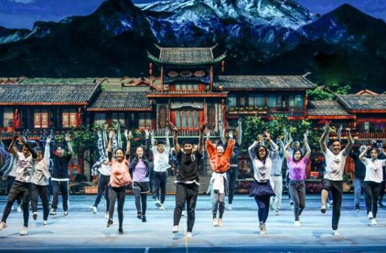 大幕拉開(kāi),玉龍雪山好像直接被移到了銀幕上了,逼真效果有點(diǎn)驚人。雪山腳下的麗江古城,商賈游人川流不息,時(shí)尚青年男女們走哪兒都在蹦跶跳舞,上演著百老匯歌舞劇里那種常見(jiàn)的群嗨。