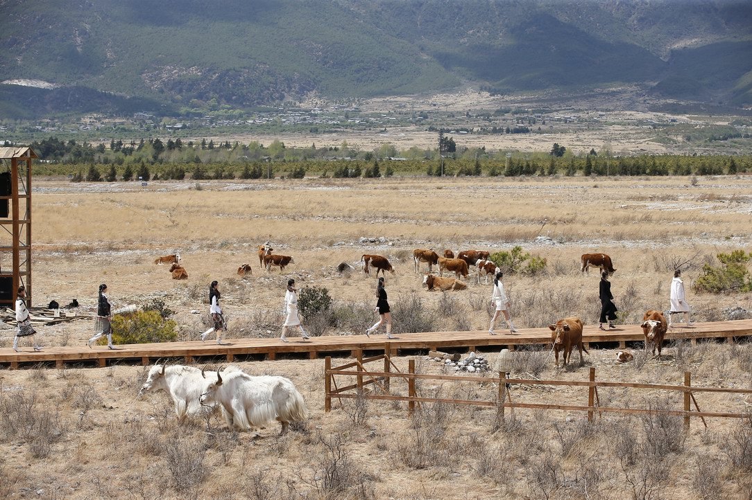 發(fā)布會(huì)秀場(chǎng)真實(shí)還原了當(dāng)?shù)赜文磷迦旱纳顚?shí)景,以雪山為背景,取自然之大成,木堆、瞭望塔、草垛、柵欄、牛羊等元素裝飾凌空而起,將靈性自然的意境躍然眼前,以最直觀的方式將原生態(tài)韻味展現(xiàn)給現(xiàn)場(chǎng)觀秀嘉賓。