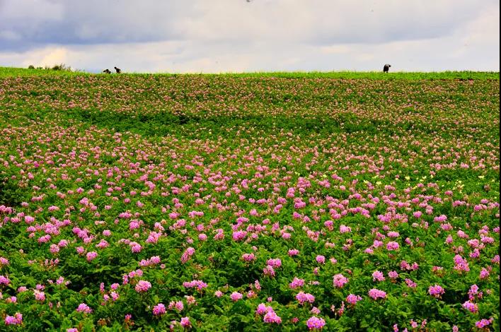 太安的洋芋花分別是:白色、粉色、紫色,3個不同的色彩,一朵朵的小花,就像一個情竇初開的少女,羞澀惹人愛。哈哈,雖然你吃過土豆,但是你有見過如此大片三色彩的花海嗎?一行人漫步在色彩斑斕的三色世界,走在花間小道,隨處可見的游客,在田間嬉戲拍照,輕輕撫摸花枝,俯下身細聞洋芋花粉的獨特味道,香氣撲鼻。站在小山峰俯瞰整個的洋芋花海,藍天白云的天,和五顏六色的花海?;ê吞炜眨瑑煞N鮮明的顏色,搭配在一起,讓眼前的景變成了一張美麗的明信片。